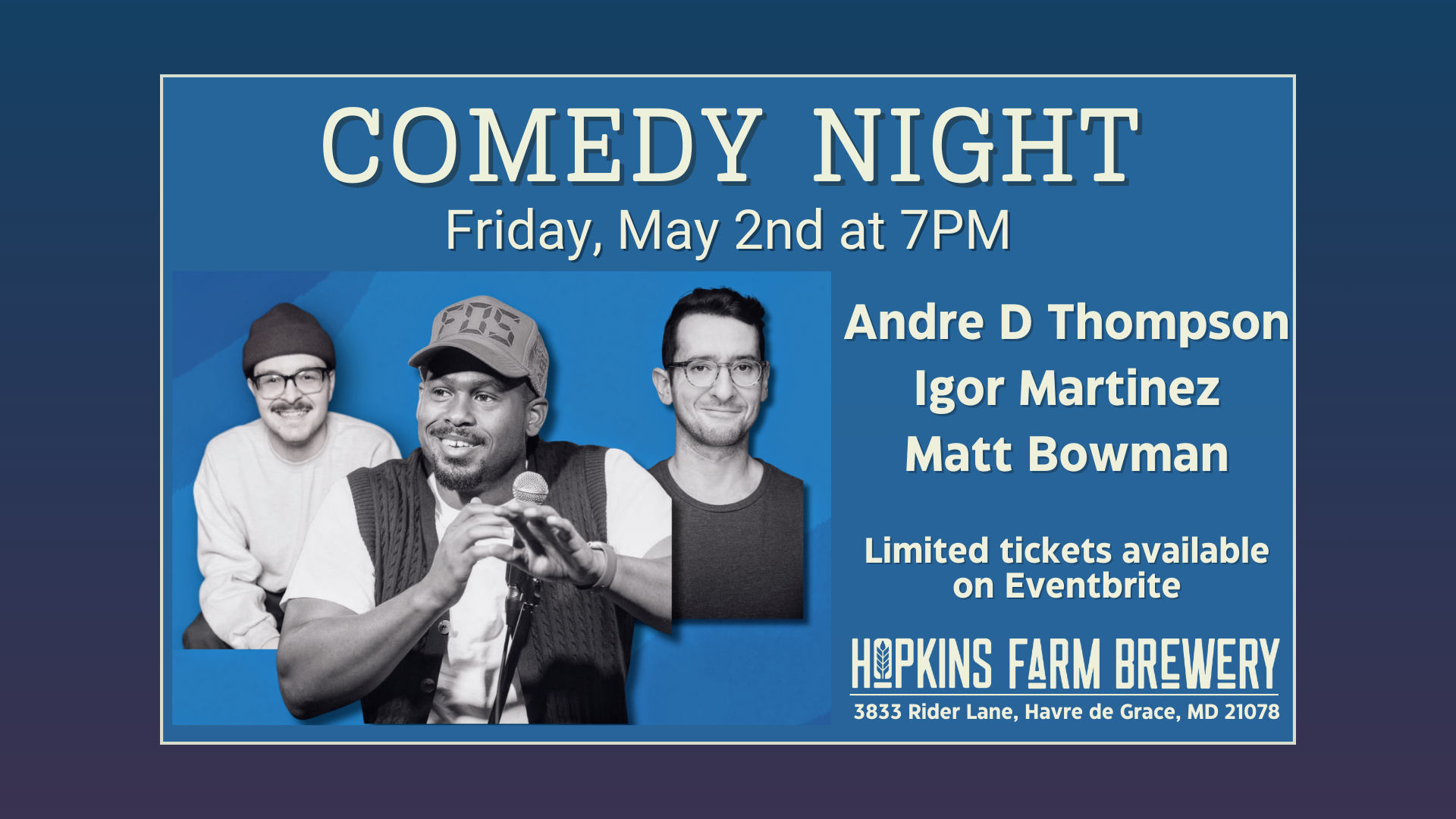 If you're looking for a good laugh and a great time, come on down to Hopkins Farm Brewery for a night filled with hilarious jokes and stand-up comedy. This month we've got comedians Matt Bowman (Prime Video), Igor Martinez (New York Comedy Festival) and headliner Andre D Thompson (Comedy Central, The Tonight Show) so you're guaranteed to be entertained all night long!